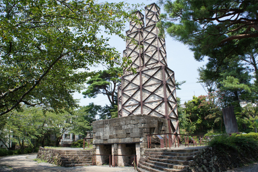 国指定史跡韮山反射炉。韮山反射炉は、実際に稼働した反射炉として日本で唯一残っている国指定の史跡です。炉体と煙突の部分を合わせた反射炉の高さは約15.7mです。
