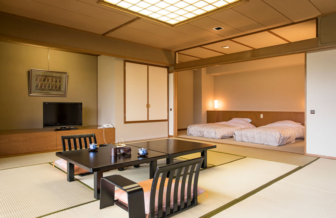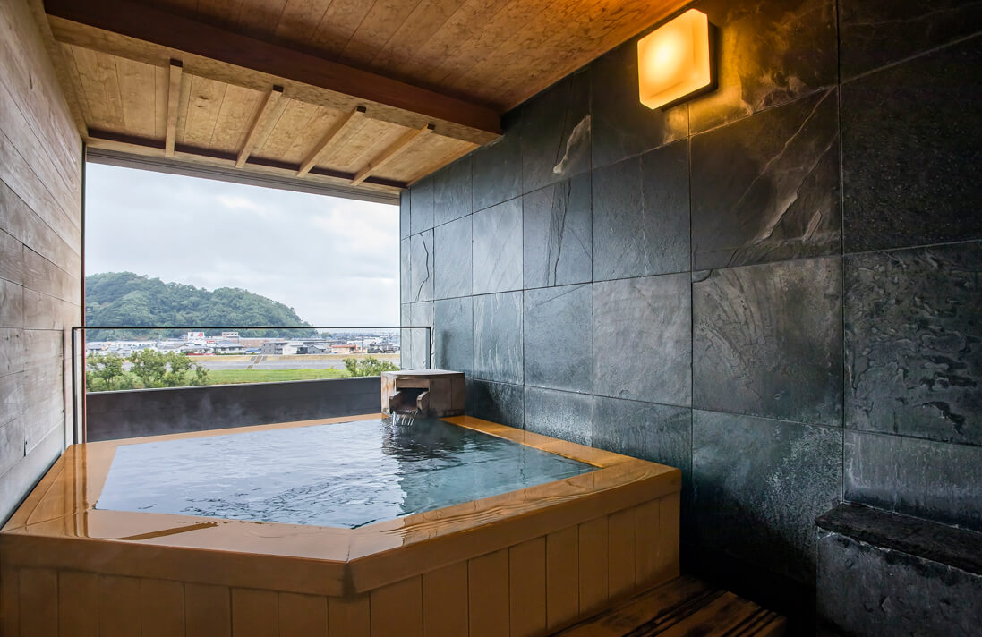 広々とした客室からの絶景はもちろん、ヒノキを使用した露天風呂で愉しむアルカリ単純泉など、ゆったりとした空間で寛ぐ至極のひとときをお過ごしいただけます。
